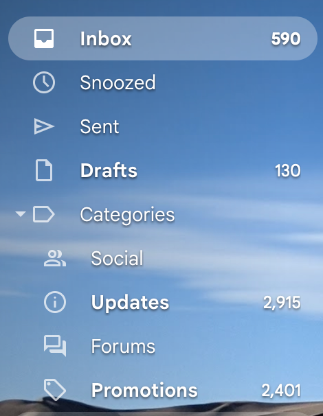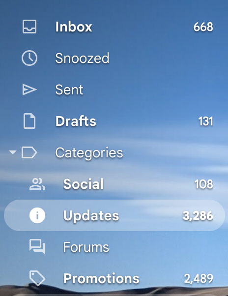 My "Updates" read 6k about three months ago. But once a month, I wake up, clean up the apt a bit use that "cleaning" energy to clear out my Gmail. I listen to music or podcast and dedicate an hour to my minimalist journey. I serach by names, using "[name]" to isolate specific brands or people. I scroll to page 50+ to look at older emails that I've probably let pile up in the past. And once I see something I don't want or need anymore. I search and purge using "Select all."